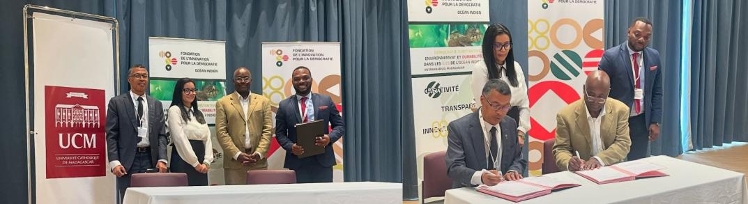 Signature d'une convention entre la FONDATION de l'INNOVATION pour la DEMOCRATIE et l'Université Catholique de Madagascar (UCM) pour la création de l'antenne Océan Indien